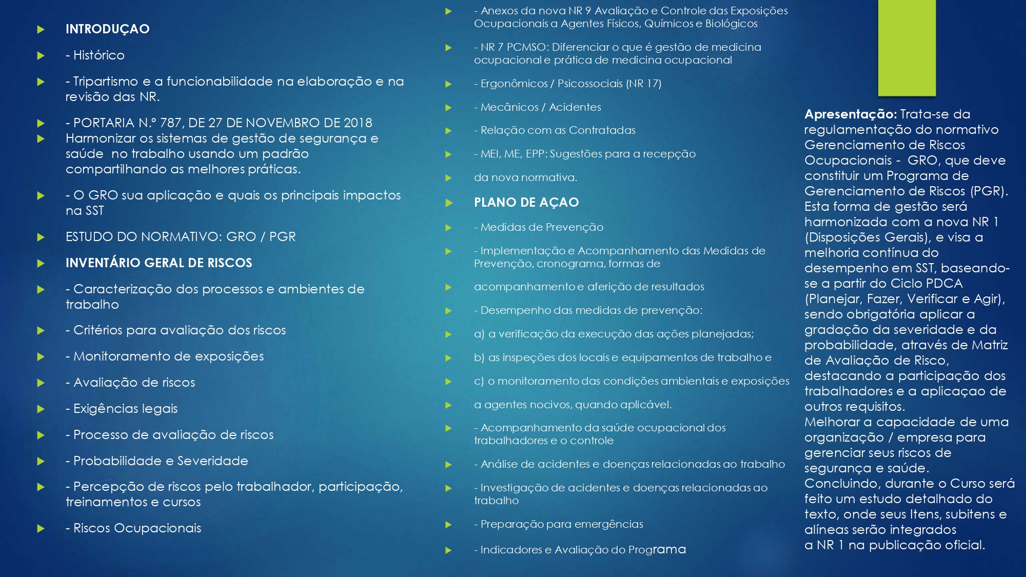 Curso GRO / PGR Gerenciamento de Riscos Ocupacionais.